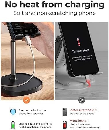 USER-FRIENDLY DESIGN: [No bent & tangling & tip over worries] when using while charging. Due to bent cable, the low phone dock maybe fall over. LISEN stylish adjustable phone holder for desk has a reserved charging hole design, supports cable management, [No bent & tangling & tip over worries]. This phone pad will not cover the subtitle when you watch the video