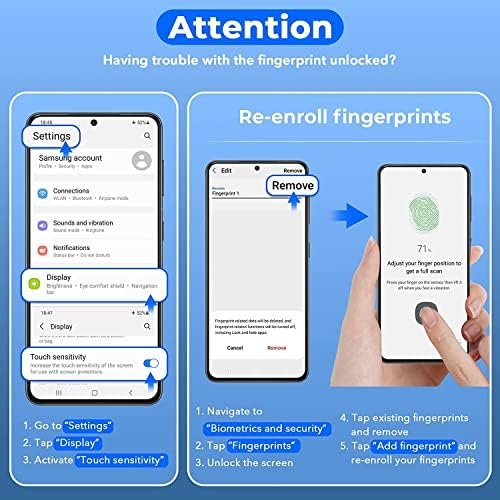 ♦Sensitive Touch Screen: The s22 ultra protection supports fingerprint unlocking in one second, and the precise positioning design makes the protector perfectly compatible with the fingerprint sensor of the screen, ensuring a quick response.