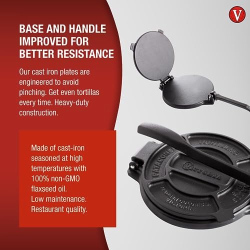 Give your cooking and tortillas the upgrade they deserve with high-quality cast-iron cookware. Cast-iron cookware is superior to traditional cookware because it offers better heat retention and durability and outlasts more conventional tortilla presses. The Victoria Cast-Iron Tortilla Press is commercial-grade and built from high-quality cast iron with the cook in mind. It features a reinforced design with engineered plates that avoid pinching and a reinforced base for better resistance.